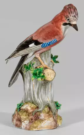 Felsiger, von plastischem Blattwerk mit Eicheln belegter Sockel mit emporragendem Eichenstamm, darauf sitzender Eichelhäher in naturalistischer Modellierung und Staffierung, den Kopf nach rechts neigend. Polychrome Malerei. Entw. August Ringler, 1863. Modell-Nr. F 104 (b). Rest.; Schwertermarke. H. 37,5 cm.