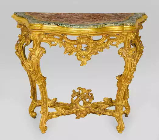 Holz, geschnitzt, gefasst und vergoldet. Passig geschweifte, durchbrochen gearbeitete Zarge aus üppigen, asymmetrisch angelegten Rocaillen auf korrespondierenden, stark geschwungenen Volutenbeinen. Unterhalb entsprechende, kreuzförmig angelegte Stege mit plastischer Rocaillebekrönung. Korrespondierende, profilgerahmte Scagliola-Deckplatte aus in unterschiedlichen Rot-, Gelb- und Grüntönen gemasertem Stuckmarmor. Stempel "II G.C. VENEZIA". H. 93,5 cm 114 cm x 56,5 cm.