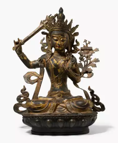 Himalaya, 20.Jh. Kupfer mit Resten von Vergoldung und Kaltbemalung. Auf Lotusthron sitzender Bodhisattva, in seiner erhobenen rechten Hand das flammende Schwert. H 66 cm.
