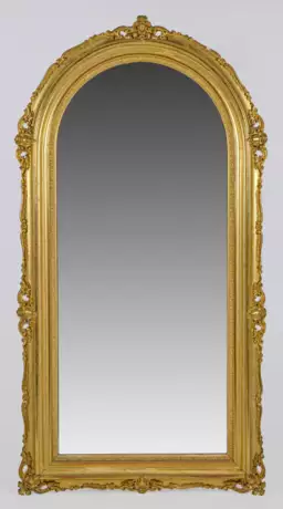 Holz, stuckiert, gefasst und vergoldet. Hochrechteckige, umlaufend profilierte Spiegelrahmung mit Palmettenfries sowie durchbrochen gearbeiteten Voluten- und Kartuschenmotiven. Hochgewölbter oberen Abschluss mit kleiner Maskaronbekrönung. 210 cm x 110 cm.