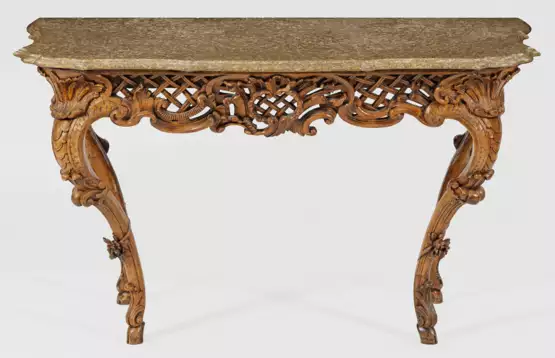 Eichenholz, reliefplastisch geschnitzt. Breite, durchbrochen gearbeitete Zarge aus Gitterwerk und Rocaillen auf stark geschwungenen Volutenbeinen. Gering überstehende Deckplatte aus grau-braun gemasertem Marmor. H. 77 cm. 132 cm x 68,5 cm.