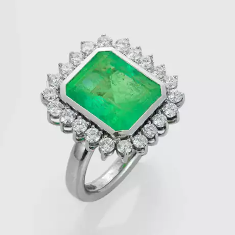 Weißgold, gest. 750. Zentral besetzt mit einem Smaragd von ca. 14 x 12 x 8,5 mm, entouriert von Brillanten von zus. ca. 0,80 ct.; Gew. ca. 14,81 g.