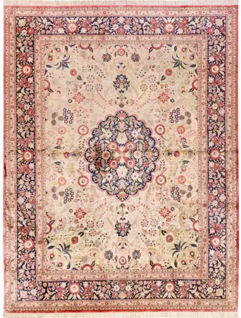 Kunstseide auf Baumwolle. Im elfenbeinfarbenen Innenfeld großes, dunkelgrundiges Zentralmedaillon sowie flächendeckende Musterung aus Blüten. Umlaufend breite, korrespondierende Blütenbordüre, begrenzt von schmalen Bändern. 407 cm x 317 cm.
