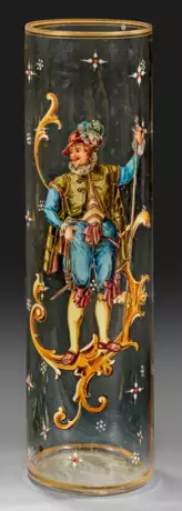Farbloses Glas mit Emaildekor. Hohe Zylinderform. Schauseitig die Figur eines Landsknechts, auf der Wandung punktuell gesetzte Blumen und Sterne in Reliefemail, oberer und unterer Rand goldfarben konturiert. H. 37 cm.