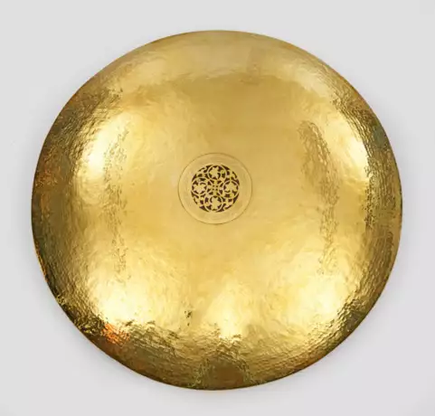 sog. Gelbkupfer, poliert. Rundes, flach gewölbtes Wandschild mit flächendeckendem Hammerschlagdekor. In der Mitte, floral-ornamental durchbrochen gearbeitetes Tondo, umgeben von schmaler Bordüre aus stilisierten Blattranken. Rückseitig sechs Lampenfassungen, elektrifiziert. D. 96 cm.