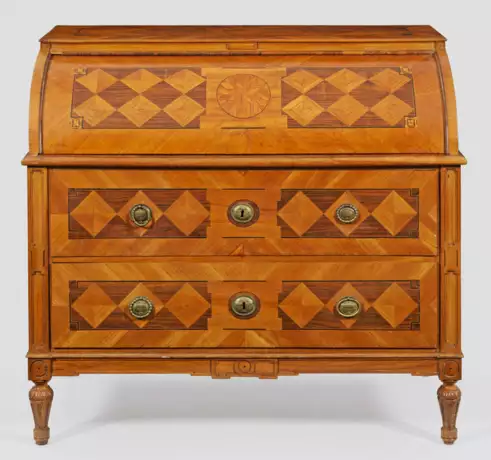 Kirschbaum, furniert sowie Einlagen aus Nussbaum, Rosenholz und Ahorn. Gerader rechteckig angelegter Korpus, flankiert von profilierten Lisenen auf kurzen Balusterbeinen. In der geggliederten Front zwei breite Schubladen. Oberhalb ausziehbare Arbeitsfläche mit bombierten Zylinderverschluss. Flächendeckend breite gerahmte Furnierfelder mit Rautendekor, von Bandeinlagen begrenzt. H. 111 cm. 123 cm x 63 cm.
