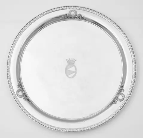 Silber. Runde Grundform mit flachem Spiegel und leicht ausschwingender Fahne, der Rand von Eierstabfries gesäumt. Auf der Fahne appliziert drei Lorbeerkränze mit Zierbändern, mittig im Spiegel graviert ein Wappen unter Freiherrenkrone. Gebrauchsspuren. Gest. 800, Herstellerzeichen. Gew. ca. 2170 g. D. 50 cm.