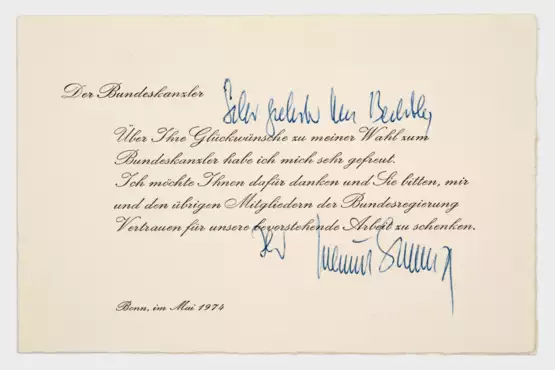 Klappkarte vom Mai 1974, 4°-quer Format, Büttenkarton, vorderseitig bedruckt, am oberen Rand eingeprägter Bundesadler, eigenhändige Anrede, Signatur mit passendem stempelentw. Umschlag, oben links von fremder Hand mit Bleistift bez. "Helmut Schmidt". Der SPD-Politiker und Bundeskanzler Helmut Schmidt (1918 Hamburg - 2015 ebenda) bedankt sich bei Friedrich Bechtle für dessen Glückwünsche nach seiner Wahl zum Bundeskanzler 1974. Minim. Alters- und Gebrauchsspuren, minim. Knickspuren.
