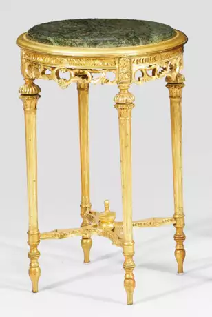 Holz reliefplastisch gestaltet und vergoldet. Bombierte, durchbrochen gearbeitete Zarge auf hohen, kannelierten Balusterbeinen, unterhalb durch schmale Stege verbunden. Profilgerahmte Deckplatte aus grüngemasertem Marmor. H. 73 cm. D. 48 cm.