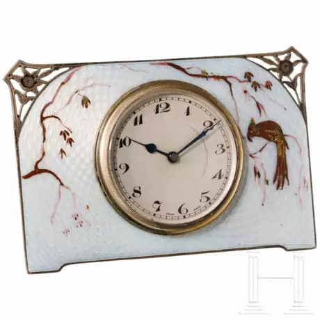 Rechteckige Silberplatte, verziert mit weißer Emaille auf wellenförmig guillochiertem Grund. Bunt gemalter Vogel, auf einem Ast sitzend. Die oberen Ecken durchbrochen in Form von Blüten gearbeitet. Punziert mit Silberstandard, Stadtmarke, Jahresbuchstabe "B" und Meistermarke "AC". Mittig eingelegte Uhr mit arabischen Zahlen, Ziffernblatt bez. "SWISS MADE". Rückseite mit Messingständer. Funktionsfähigkeit nicht geprüft. Maße 7,5 x 11,4 cm, Gesamtgewicht 186 g.