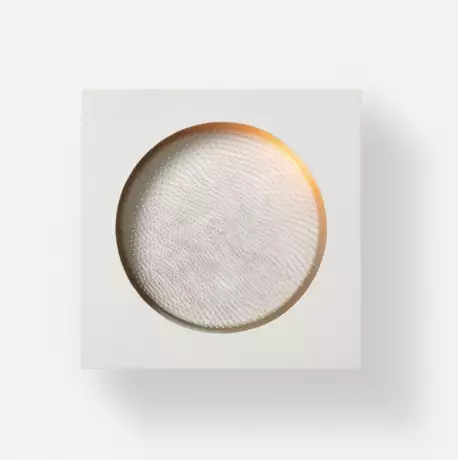 Technique: Hammered-in nails and white paint on canvas, on a wooden disc. In wooden box, polychromed white. Illuminated and wired for electricity.