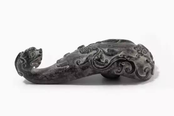 China, Qing-Dynastie. Graue Jade mit Kalzifizierungen. Leicht gewölbter Haken, der in einen Drachenkopf mündet. Der birnenförmige Körper mit zwei reliefierten Drachen. Ovaler Knopf auf der Rückseite. L 14 cm.
