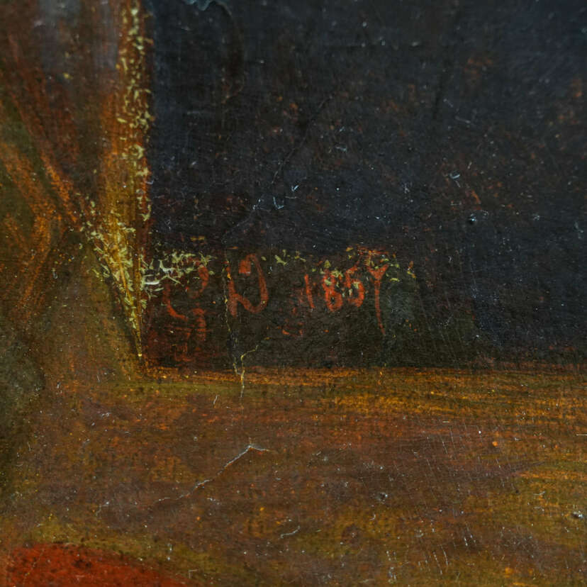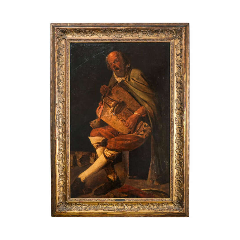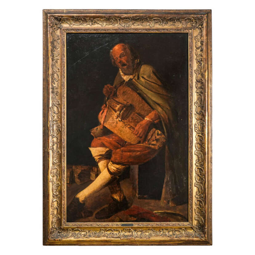 Copy after George de La Tour: Le Vielleur / Hurdy-gurdy player, oil on wood, 100 x 64 cm panel dimensions, monogrammed, dated 1859, extensively retouched and restored, partial loss of colour