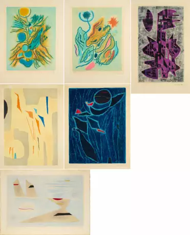 a) Untitled. 1956. Colour lithograph on Johannot (watermark). 41 x 25 cm (50,5 x 32 cm). Signed and dated. From an unknown edition. Kestner-Gesellschaft Hannover (publisher).
