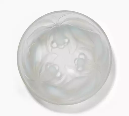 Frankreich, um 1925. Farbloses, opaleszentes Glas, moulé-pressé. Kirschendekor. An der Wandung signiert "G.VALLON" (Formgepresst). D 23,5 cm.