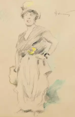 (1849 Dillingen - München 1929). Frau mit Hut. Aquarell und Kohle auf Papier. 43,5 x 29 cm. In Kohle ob. re. sign. Ger.