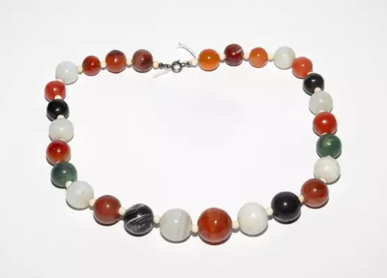 China, 20.Jh. Diverse Halbedelsteine, Metallkarabiner. GL 49 cm.