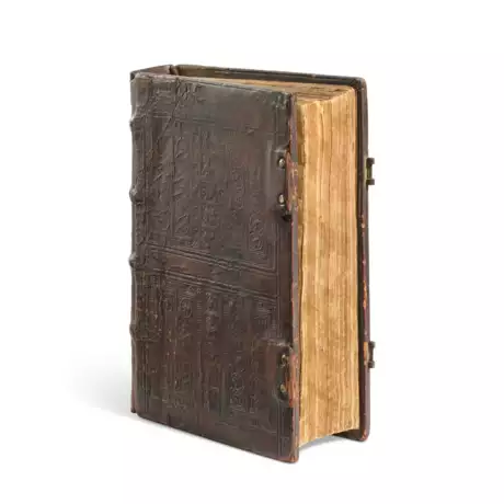 Quarto (198 x 135 mm). Without final blank O8. Double columns, title in red and black, headings in red. Woodcut title-page and initials (hinges of title and following leaf renewed, waterstaining at margins most pronounced at the beginning and end, bottom corners of k6 and r3 lost, marginal fraying most obvious at G). Contemporary French blindstamped calf, new endpapers (rebacked, lacking clasps, creased with small losses mainly at hinges and edges). Provenance: Marginal notes in Latin in a 16th-century hand on ff.131-4; William Hillary M.D. (1697–1763, author on tropical diseases; his annotations in Latin on title and final page), purchased in 1730 from the bookseller Robert Gray according to annotation on the title; ‘James Haywood’, surgeon (beside the erased ownership inscriptions at head of title); two small stamps ‘4127’ on title; S. & B. Nock Medical and General Booksellers (ticket inside upper cover); Royal Society of Medicine (ink stamp [Medical and Chirurgical Society] on verso of title and on final page).