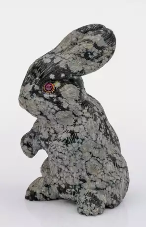 Wohl Schneeflocken-Obsidian. Die äußerst naturalistisch gestaltete, geschnitzte Miniaturfigur eines auf den Hinterläufen stehenden Hasen aus grau geflecktem Stein, besetzt mit zwei roten Granatcabochons als Augen. Originalbox. H. 5,5 cm.