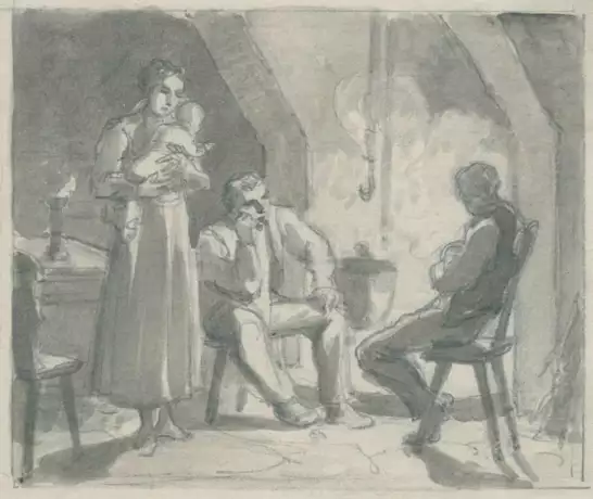 (1774 Lausanne - Zürich 1850). Familie in einer Küche am Feuer. Pinsel in Grau über Bleistift, mit Bleistiftlinie umrandet, auf Velin. 8,4 x 10,3 cm. Entwurf für eine Buchillustration.
