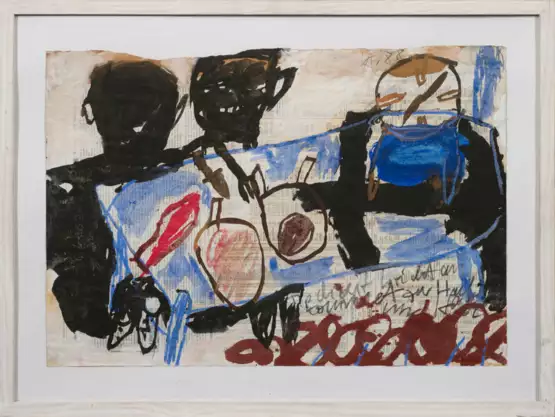 Abstrahierte, gestische Komposition mit figurativen Assoziationen und Textpassagen. Heike Pillemann studierte 1977-1983 an der Stuttgarter Akademie bei Peter Grau, Rudolf Haegele und Paul-Uwe Dreyer, anschließend ging sie nach München. Mischtechnik mit Eitempera/Zeitungspapier. R. ob. monogr. und dat. (19)88. Ca. 40,7 cm x 56,2 cm. Rahmen.