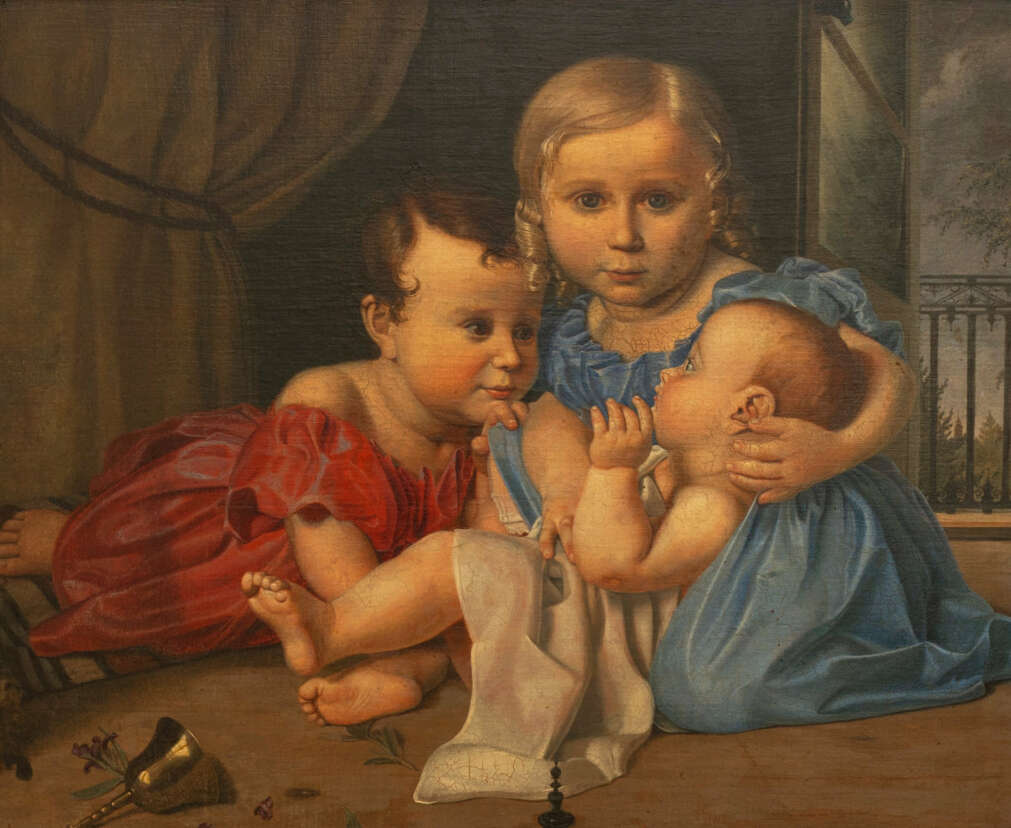 Three Children, oil on panel, 48.5 × 59 cm, lower left inscribed, faintly legible