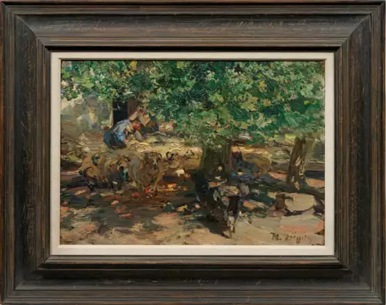 Unter einem Lindenbaum strömen Schafe aus einem Stall, während ein Hund ihnen kläffend entgegen läuft. Im Bild eingefangen ist das flirrende Licht eines spätfrühlingshaften Morgens, an dem sich die Schafe freuen, ihren engen Stall zu verlassen. Sie tragen noch die wärmende Wolle. Als Sohn eines Schäfereibesitzers hatte von Zügel eine besondere Affinität zu Schafen, Schäfern und anderen Hirten, die ein Hauptsujet des Tiermalers waren, denn offenbar teilten auch Sammler diese Begeisterung. Auf der Wiener Weltausstellung 1873 erhielt er für das Gemälde "Schafwäsche" die silberne Medaille. Anfang der 1890er Jahre wandte er sich dem Impressionismus zu, die Wiedergabe der Tiere im Spiel von Licht und Schatten wurde zum wesentlichen künstlerischen Anliegen. Hierbei ordnete er die Details immer stärker dem Gesamteindruck seiner pastos aufgetragenen Farblandschaft unter. Öl/Lwd. R. u. sign. 47 cm x 63 cm. Rahmen.