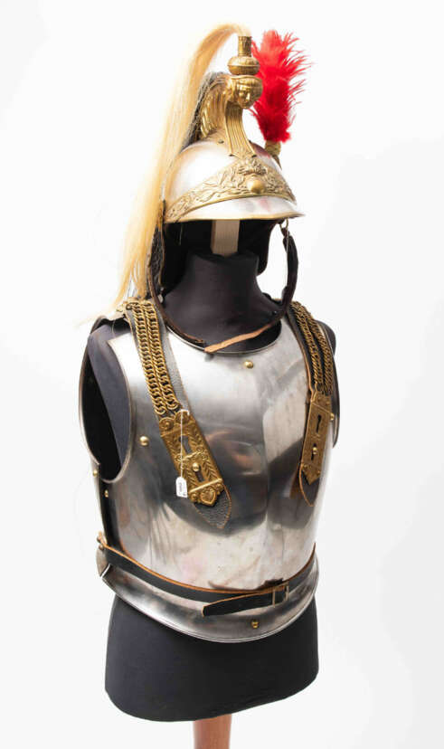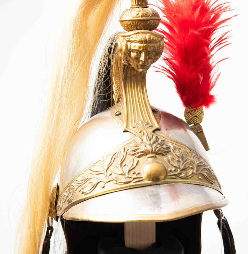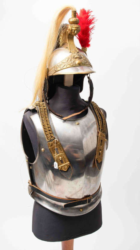 Frankreich, Helm M 1872, Unteroffizier. Harnischbrust und Rücken M 1855, dat. 1892, eines Kürassier-Offiziers. Helm mit Stahlblechglocke und im Empire-Stil verzierter Messinggarnitur. Stirnemblem mit explodierender Granate zwischen Lorbeerranken. Helmschmuck in Form eines schwarzen und eines weissen Rossschweifs. Innenseite mit originaler Belederung. H 28 cm. Blanke Harnischbbrust aus Eisen mit Ziernieten aus Messing. Innenseite sign. "Manufacture de Chat(ellerault) Xbre 1892 3ième taille largeur extra No. 1 Officier". Rücken aus weniger starkem Material, innen identisch signiert. Gut erhaltene Schulterketten mit Löwenmascarons und laubverzierten Verschlussblechen. Belederung wohl ergänzt. H 40 cm.