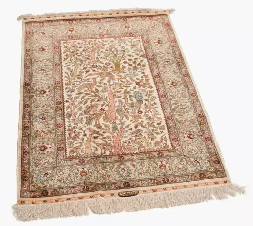 NW-Türkei, um 1980. Unten in der Mitte signiert mit "Uzabek Hereke". Sog. "Lebensbaummotiv" mit Paradiesvögeln. Dichtes florales Werk mit kleinen, metallbroschierten Blüten. Dekorative Bäume und verschiedenste, fein gezeichnete Vogelpaare zieren flächendeckend das beige Mittelfeld. 2 filigrane Vogel-Nebenborten umranden die, mit grünen Palmetten und Blattranken belegte Hauptbordüre. Sehr gute Erhaltung. 77x110 cm (ft. 2.5x3.6).