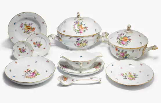 Nach 1945. Porzellan. Osier. Bestand: 15 Fleischteller (D 25,5 cm), 10 Suppenteller (D 24 cm), 12 Salatteller (D 20,5 cm), 1 runde Schale, 1 viereckige Schale, 1 runde Platte, 2 ovale Platten, 1 Saucière auf Untersatz mit 1 Löffel, 1 runde und 1 ovale Terrine, 10 Beilagenteller (D 15,5 cm), 12 Brotteller (D 12 cm), 12 Bouillontassen, 1 Kerzenstock (1 oder 2-flammig). Total 81 Teile.