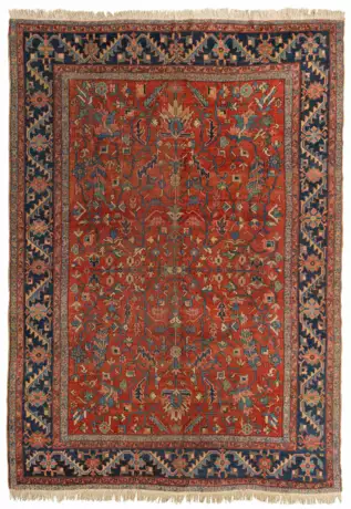 NW-Persien, um 1910. Sehr dekorative und ausgefallene Musterung. Im roten Mittelfeld figurieren 2 sich spiegelnde, grosszügig angelegte Heriz-Palmetten, flankiert von eindrucksvollen, stark stilisierten Heriz-Blüten in verschiedensten Grössen, blauen Blütenzweigen und gestreuten Blattranken in aparten Farbtönen. 4 filigrane Rosettenborten in Hellblau und Rot säumen die nachtblaue, mit geometrisch gezeichneten Blütenpalmetten und Sägeblättern dekorativ verzierte Hauptbordüre. Gebrauchsspuren. 280x360 cm (ft. 9.2x11.9).