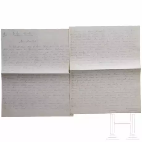 Zwei Bögen liniertes Papier (Maße 27,2 x 22 cm) mit oberseitiger Perforation, beidseitig in Bleistift beschrieben: "Mein Herzlieb! Du bist so süss, dass ich keine Worte mehr für Dich habe.". Göring ist überglücklich über ihren Brief vom 1.9., "den ich vorhin bekam", bittet sie um Verzeihung für die geäußerten Zweifel und alles Hässliche, beteuert ihr seine Liebe und möchte sofort mit ihr wieder zusammen sein. Er erkundigt sich, was man in Schweden über ihn denkt, "Was spricht Nils über mich? Glaubst Du, ich soll ihm einen süssen Brief schreiben?", und bittet sie, ihren Schwestern seine Adresse in Bayrischzell zu geben, "denn [.] Mama öffnet die Briefe" in München. Zudem muss sie ihm versprechen, zum Arzt zu gehen, "Und tue es gleich, damit man die Rechnung noch dort zahlt. [..] Du musst Dir auch noch rechtzeitig dort Kleider und Kostüme machen lassen, man hat Dir dafür ja in den letzten Jahren nichts gegeben. Den Brief Deiner Schw.mutter finde ich ob ihrer Armut einfach lächerlich und einen grossen Bluff. [..] Du musst absolut einen tüchtigen Advokat haben!". Er schließt mit "Herzinnigste Küsse voll heisser Liebe Dein treuer H.". Mehrfach gefaltet, die erste Seite links oben nummeriert "16.", das zweite Blatt bezeichnet "II".