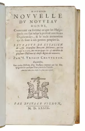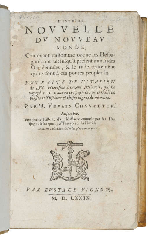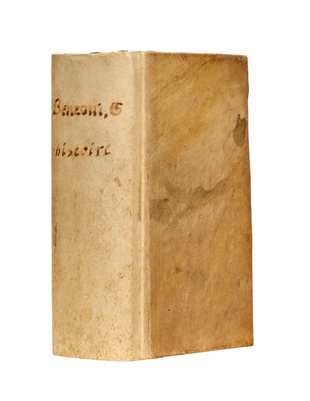 First French edition of Benzoni’s disparaging history of Spain’s conquest of America, with tract on an unsuccessful French attempt to colonize Florida. One of the earliest non-Spanish sources to document Spain’s colonization of the New World, Benzoni’s memoirs were first published in Italian in 1565. They were the result of living 15 years in Central and South America. The present edition is the first vernacular translation. “Its major impact came from Benzoni's vivid descriptions of Spanish cruelty to the native populations, which contributed to the dissemination of ‘La Leyenda Negra’ (the Black Legend). As much as the Protestants admired his book, the Spanish reviled it as propaganda” (Oxford Companion to World Exploration).