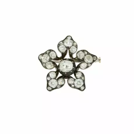 Description: Delicate brooch in the shape of a flower, set with diamonds and engraved on the back. Pin