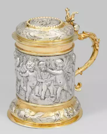 Silber, teilw. vergoldet. Gewölbter Stand, umzogen von reliefplastischem Band aus großflächig getriebenen, fein ziselierten Blüten und Blattwerk sowie abgesetzt glatter Standring. Von schmalen Profilringen gerahmter, zylindrischer Korpus mit mehrfach profiliertem, glattem Rand. Die Wandung umlaufend verziert mit stark reliefplastisch getriebenem und fein graviertem Reigen aus tanzenden und musizierenden Putti vor baumbestandener Landschaft. Wulstartig gewölbter, scharnierter Deckel mit korrespondierendem Blüten- und Blattdekor und ausgestelltem, glattem Rand. Zentral eingelassene, von einem Lorbeerkranz und Perlband gerahmte, runde Plakette mit reliefplastischer Darstellung von David und Goliath. Aufwändig reliefierter und plastisch gearbeiteter s-förmiger Henkel in zwei- bzw. dreigeteiltem Knorpelwerk endend. Auf der Unterseite des Standrings eingravierte altgriechische Inschrift. Auf dem Rand und der Standunterseite mehrfach eingeschlagene "75". Innen vergoldet. Gest., mehrere Tremolierstriche, Beschaumarke, Meister Hanß Lambrecht III (wird Meister 1630), Moskauer Repunzierung von 1778. Gew. ca. 905 g. H. 19,5 cm.