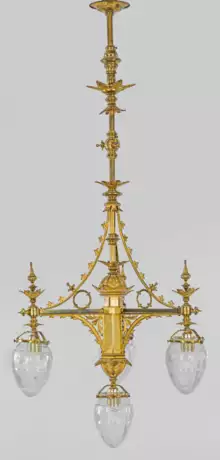 4-flg.; Messing, vergoldet und farbloses, teilw. satiniertes Glas. Gestreckter, mehrfach gegliederter Balusterschaft, flankiert von schlanken, ornamentierten Streben als Träger für Leuchtmittel mit tropfenförmigen, ornamentierten Lampenschirmen. Elektrifiziert. H. 120 cm. D. 46 cm.