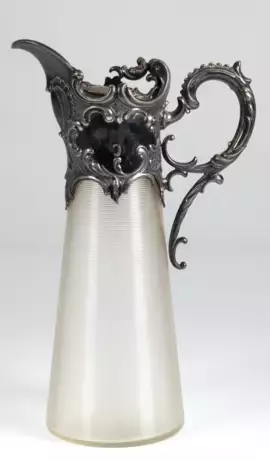 Лот 692 | Historismus-Schenkkanne mit versilberter Metallmontierung, um 1880, konischer Glaskorpus mit horizontalem Rillendekor, reich reliefierte Metallmontur mit Scharnierdeckel und hochgezogenem Ohrenhenkel, H. 29,5 cm