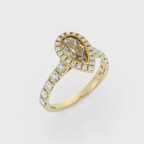 Roségold, gest. 750. Zentral besetzt mit einem apricotbraunen Diamanten von ca. 1,02 ct. im Pearcut, entouriert von Brillanten von zus. ca. 1,00 ct. (F/vvs). Gew. ca. 3,97 g.