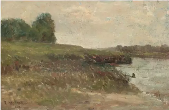 Лот 63 | Höckner, Rudolf (1864 Gut Hilmersdorf-1942 Mergentheim) "Uferlandschaft", Öl/MK, sign. und dat. 1909 u.l., 19x28 cm, Rahmen