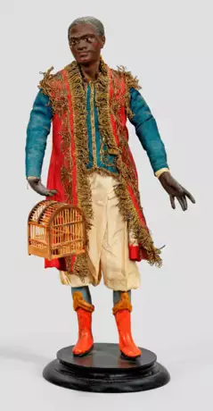 Page in prunkvoller, zeitgenössischer Tracht des 18. Jh., Seide mit Brokatstickerei. Terrakotta und Holz, farbig gefasst, einen Vogelkäfig bei sich führend. Runder, ebonisierter Holzsockel, neuzeitlich. Ges.-H. 34 cm. Minim. Alters- und Gebrauchsspuren.
