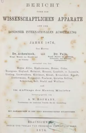 Berichte von 24 dt. Wissenschaftlern, darunter: ╔E.Gerland╗ über historische Apparate, ╔H.Bruns╗ über Apparate der Arithmetik und Geometrie, ╔L.Loewenherz╗ über meteorologische Apparate, ╔J.B.Listing╗ über optische Apparate, ╔E.Abbe╗ über Mikroskope etc. - Stockfleckig, St.a.V. - Selten.
