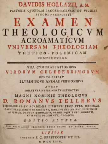 VD 18, 10418229. - Seltene Ausgabe (EA 1707) dieses letzten der großen Systeme der lutherischen Orthodoxie. - Tls. gebräunt. Ohne das gest. Portrait-Front.
