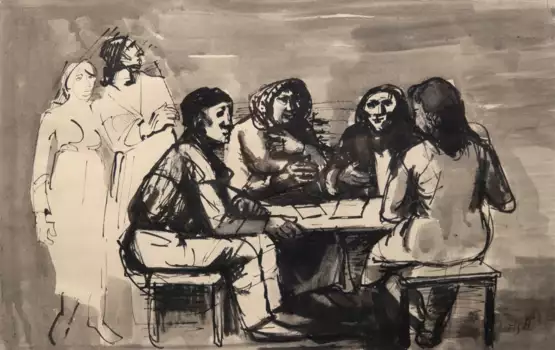 Лот 136 | Holtz-Sommer, Hedwig (1901 Berlin- 1970 Wustrow) "Besprechung", Tusche, monogr. u.r., 30x45,5 cm, im Passepartout hinter Glas und Rahmen