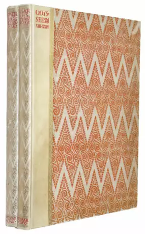 Brinks 29-30 Müller-Krumbach 17-17a Schauer II, 50 Sarkowski 784. - Erste Ausgabe der Übersetzung. - Exemplar Nr. 285 von 350 hergestellten Exemplaren der für den Handel bestimmten Ausgabe auf Bütten. (GA 425). Unter der Leitung von Harry Graf Kessler in den Jahren 1907-10 auf den Pressen von R. Wagner Sohn in Weimar in der Caslon-Antiqua gedruckt. Eric Gill entwarf die Titelblätter, jeweils mit einer Holzschnittvignette von Maillol, und die Holzschnittinitialen, von denen drei von Maillol ornamentiert wurden. Die Titel- und Zwischentitelzeilen sowie die Ornamentierungen der Initialen wurden in Rot gedruckt. Die Bezugspapiere der Deckel sollte nach Kesslers Plan Mario Fortuny liefern. Da sich dies aber für Kessler unannehmbar lange verzögerte, übernahm Eric Gill auch die Gestaltung nach einem alten mykenischen Muster. Die Odyssee kann als das erste große Druckwerk der Cranach-Presse gelten, auch wenn ihr Name im Buch noch nicht genannt wird. - Gutes wohlerhaltenes Exemplar.
