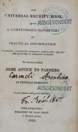 Shaw & Shoemaker 46618. Rink 181. Bitting 232. Seltenes Amerikanisches Rezept- u. Kochbuch, erstmals 1816 noch ohne Pseudonym erschienen. - Titel 2fach gestempelt u. mit hs. Besitzvermerk, nur leicht braunfleckig, Vorsätze (u. tls. auch als Ergänzung im Text) mit zahlr. eingeklebten zeitgenöss. Zeitungsausschnitten mit weiteren Rezepten, Ebd. berieben.