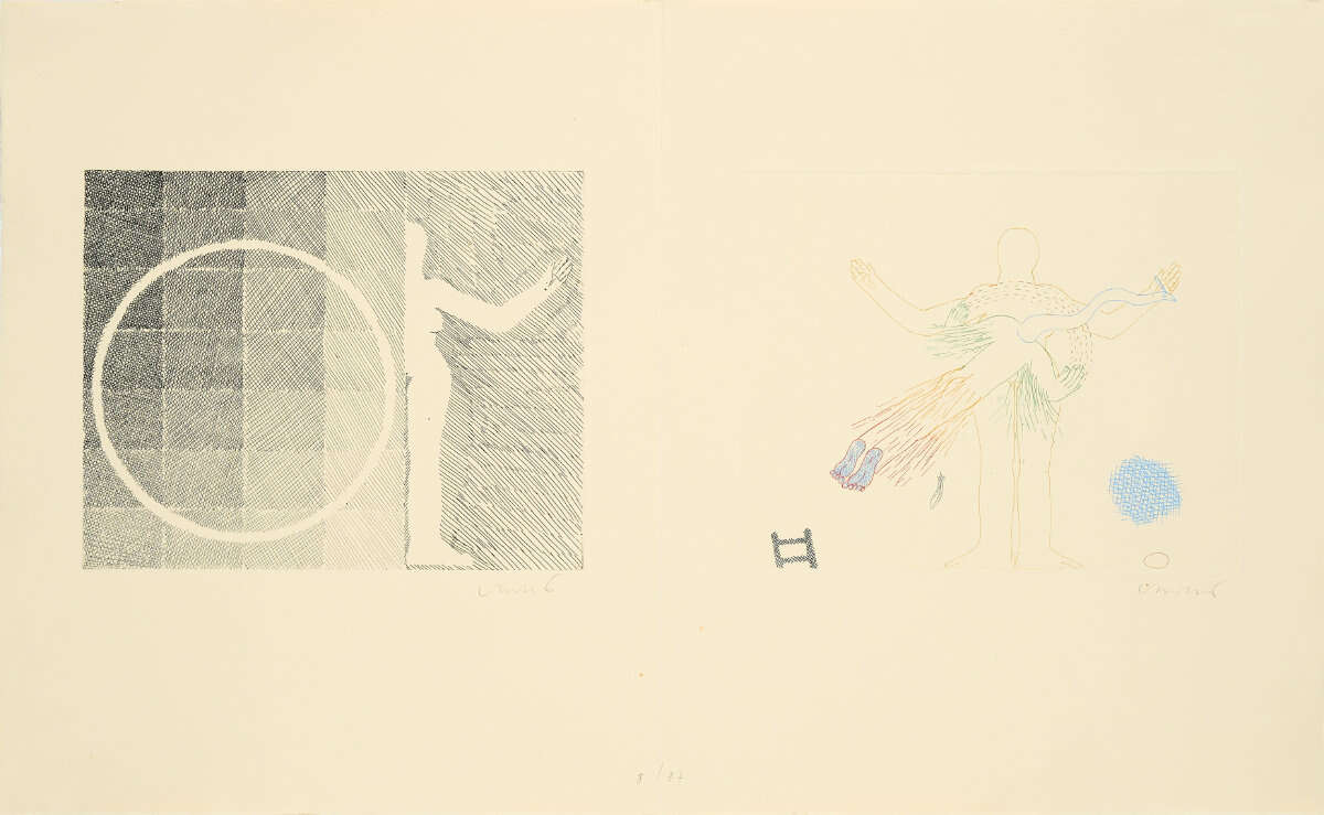 Technique: Each: etching, partly coloured, partly with embossed printing on double sheet SICELLINO 1977 (watermark).