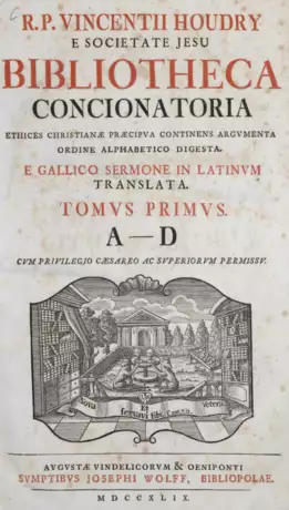 De Backer/S. IV, 489. - Zweite lateinische Ausgabe der erstmals 1711-12 erschienenen, oft aufgelegten Bibliothèque des prédicateurs des Jesuiten Houdry (1631-1729). Etw. braunfl., St.a.T., Spiegel mit Wurmfraß. Exlibris. - Dekoratives Ex. aus Klosterbibliothek.