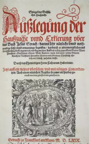 VD16 B 4103. Erste Ausgabe. - Eine Art "Hausvaterbuch" mit vielen Sprichwörtern, derben Wendungen und Beispielen aus dem täglichen Leben. - Die Traktate des frühen Luther-Anhängers Caspar Huberinus (1500-1553) erfreuten sich zu seiner Zeit großer Beliebtheit. - Der Textholzschnitt, monogrammiert von Jost Amman, zeigt das Paradies. - Titel mit hs. Kaufvermerk, datiert 1572, und etw. späterem Schenkungsvermerk, wenige Blätter mit Eckabriss, gebräunt, Register etw. wasserrandig u. mit kl. Randläsuren, Ebd. etw. fleckig u. besrieben.