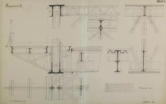 Karl Hübler wurde 1898 zum Regierungsbaumeister bei der Wasser- und Straßenbauverwaltung in Mannheim ernannt. Er war ab 1921 Ehrendoktor an der Ingenieurschule der Technischen Hochschule in Karlsruhe "in Anerkennung seiner hervorragenden Leistungen auf dem Gebiet des Erd-, Tunnel- und Wasserbaus". (s. Deutsche Bauzeitung, Bd. LV, S. 430) Hübler war zudem als Direktor des Mannheimer Bauunternehmens Grün und Bilfinger tätig. - Der erste Band mit 10 überwiegend doppelblattgroßen Entwürfen umfasst insbesondere Konstruktionszeichnungen für Eisenbahn- und Straßenbrücken aus Stahl mit Darstellungen von Grundrissen, Querschnitten, statischen Diagrammen und Eisenbahnweichen. Darunter auch eine großformatige Zeichnung auf drei Blättern mit dem Entwurf eines Trennungsbahnhofs. Der zweite Band mit 11 Zeichnungen befasst sich mit dem Entwurf einer Stauanlage und dem einer Flusskorrektion und enthält Darstellungen von Wehren, Schleusen, Längenprofilen etc. - Die Zeichnungen meist mit Maßstäben und Inschriften, überwiegend signiert und datiert. - Teils etwas fleckig, eine Zeichnung stärker. Papierbedingt etwas gebräunt. Insgesamt sehr gut erhaltene und historisch interessante Sammlung.