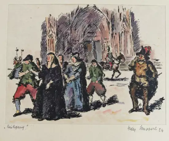 Willy Huppert, 1899 in Forbach/Lothringen geboren und am 13. Dezember 1979 in Bad Herrenalb gestorben war Maler, Autor und Kunsterzieher, der in der Region Karlsruhe lebte. Ab 1938 lehrte er Kunstgeschichte an der Staatlichen Akademie der Bildenden Künste in Karlsruhe von 1952 bis 1965 hatte er eine Professur für Kunstpädagogik inne. - Beiliegen 2 unkolor. Lithographien aus dem Werk - Bll. 3 und 5. - Selten.